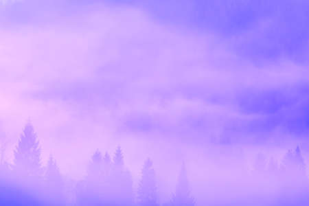 A mesmerizing view of pine trees shrouded in ethereal mist and vibrant purple hues at dawn, capturing the serene beauty of a tranquil forest landscape.