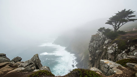Rocky cliffs meet a misty ocean with crashing waves under a foggy sky, featuring a lone cypress tree.