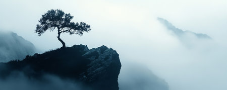 Lone tree on rocky cliff covered in mist, serene nature scene. Tranquility and solitude concept