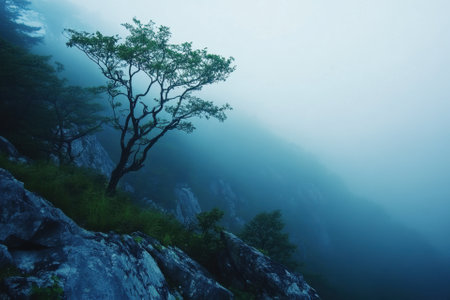 Solitary tree on foggy cliff side, serene atmosphere. nature and tranquility concept