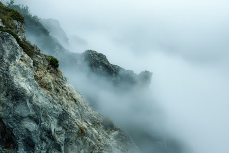 Coastal Cliffside Shrouded in Dense Fog with Rugged Terrain and Misty Atmosphere. Concept of Seaside Serenity, Mysterious Wild Landscapes, Nature's Beauty, Oceanic Weather Patterns.