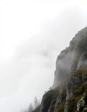 Experience the serene beauty of a misty mountain landscape featuring lush forests and rocky slopes, enveloped in a soft fog, perfect for nature enthusiasts.