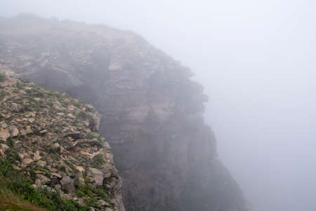 Steep cliffs with a misty gloomy sky. A thick, eerie fog hangs over the mountain and the valley.