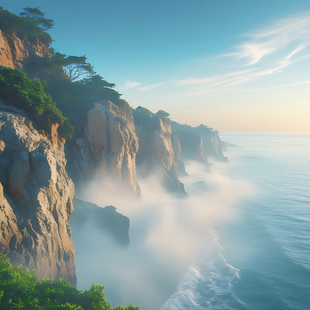 Explore the stunning coastal landscape featuring rugged cliffs and gentle ocean waves under a misty atmosphere, evoking serenity and natural beauty.