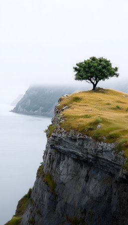 Lone Sentinel A Solitary Tree Stands Guard on a Misty Cliff, Embracing Serenity Above the Ocean