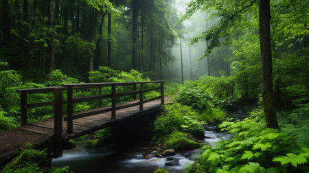 A tranquil forest scene featuring a wooden bridge over a serene stream, surrounded by lush greenery and mist. Perfect for nature lovers and peaceful retreats.