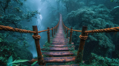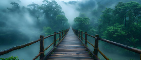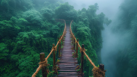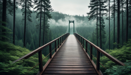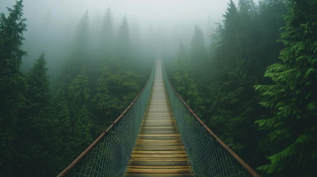 A suspension bridge stretches through a misty, lush forest, surrounded by dense green foliage, creating a serene and mystical atmosphere, evoking adventure and tranquility.