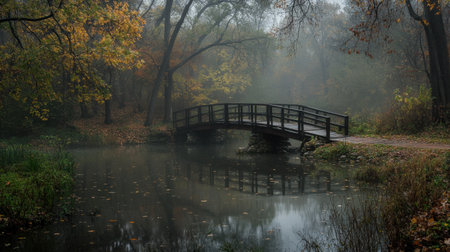 A serene autumn scene featuring a foggy bridge arching over still water, surrounded by vibrant fall foliage and drifting leaves, evoking peace and tranquility.