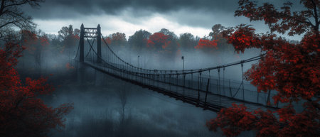 Fog engulfs a suspension bridge creating a mysterious atmosphere at dawn