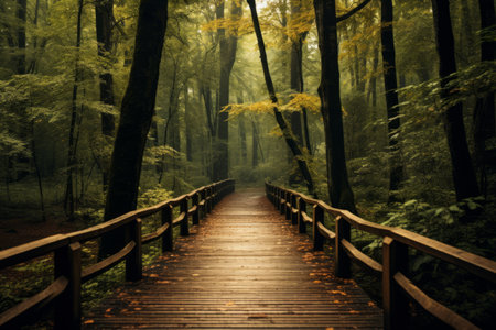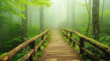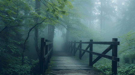 A serene wooden bridge stretches across a misty forest landscape, surrounded by lush greenery and towering trees, creating a tranquil atmosphere for nature lovers.