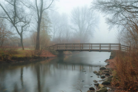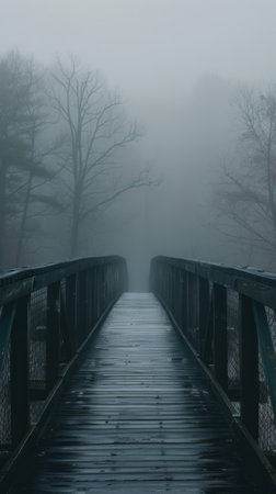 A serene scene featuring a tranquil wooden bridge shrouded in dense fog, reflecting on calm waters and framed by nature