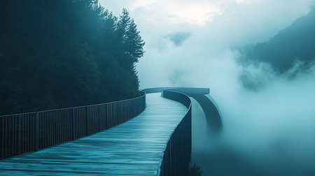 A wooden walkway with metal railings curves into a dense fog, creating a surreal and mysterious atmosphere. The path leads towards an unseen destination in the misty mountains.