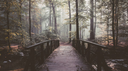 A rustic wooden bridge crosses a misty autumn stream, with golden leaves scattered across the path, inviting a serene journey into the mysterious forest, Ai-Generated.