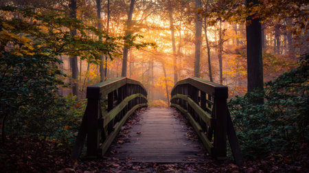 A wooden bridge spans a forest path, surrounded by trees with vibrant autumn foliage. The image showcases warm colors, soft textures, and natural lighting. The composition suggests an inviting pathway. Suitable for environmental, travel, or seasonal themed content with commercial or editorial applications.