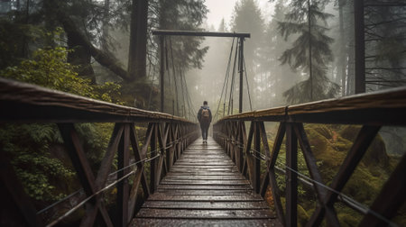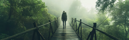 A lone traveler treks across a wooden bridge surrounded by lush greenery and fog. The serene atmosphere creates a peaceful connection with nature during early morning.