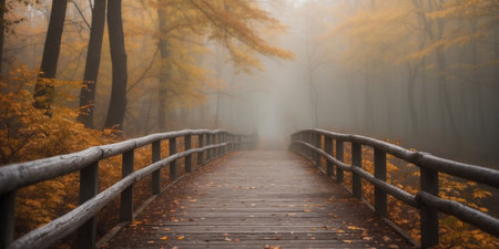 A wooden bridge covered with fallen leaves disappears into the fog within an autumn forest, casting a peaceful, yet dark, serene mood in this natural landscape.