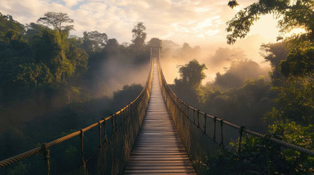 A stunning suspension bridge stretches across a misty forest landscape at sunrise, creating a serene and peaceful atmosphere perfect for nature lovers.