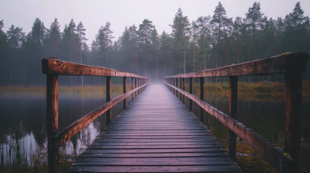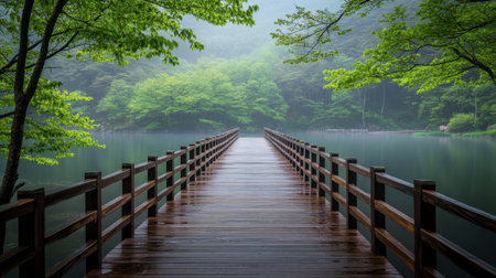 Discover a beautiful wooden bridge leading across a tranquil lake, embraced by lush trees and gentle fog. A perfect representation of serene nature and peaceful adventures.