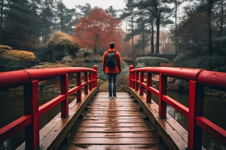 Raise see of explorer strolling on footbridge towards woodland. Creative resource, AI Generated