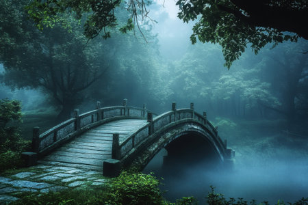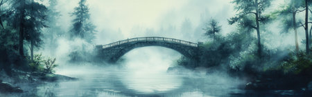 A tranquil scene featuring a charming bridge over calm waters, surrounded by vibrant green trees and soft mist, creating a peaceful atmosphere in nature.