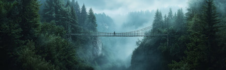 In a serene forest landscape, a lone figure stands on a suspended bridge. The early morning fog blankets the trees, creating an enchanting atmosphere filled with mystery and calm.