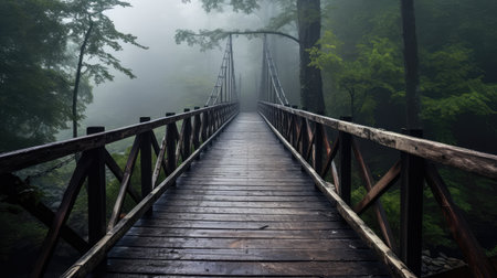 Wooden bridge in a misty forest. Low angle perspective emphasizing the bridge and the surrounding trees. Tranquil and peaceful nature scene. Perfect for nature, travel, or landscape projects.