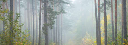 Foggy morning in the coniferous forest. Pine trees in the fog.