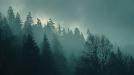 Misty forest landscape with dark green trees in deep fog. Mysterious nature scene and abstract background for tranquil mood.