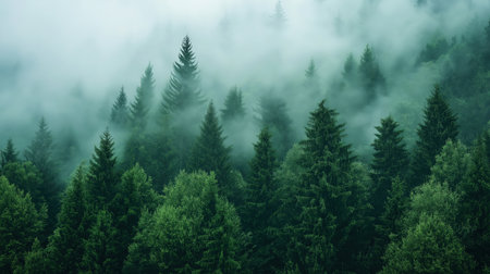A breathtaking view of a misty forest featuring towering evergreen trees shrouded in fog. This serene natural landscape captures tranquility and beauty in nature.