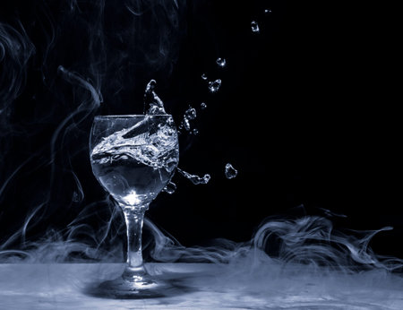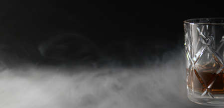 Closeup wine glass with fog at dark background. Beautiful glass with smoke and light. Selective focus