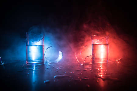 Drink, broken glass concept. Broken glasses on wooden table at dark toned background with fog. Selective focus