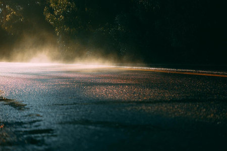 Morning fog in the city. Sunlight on the asphalt road.