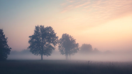 A tranquil landscape featuring mist and fog at dawn, with soft pastel colors and serene scenery, creating a peaceful atmosphere for nature lovers.