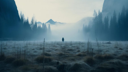 autumn morning serenity: a person, john, mysteriously walks through foggy grass, with a distant glacier and tall trees in the backdrop. this cold morning's lo-fi photo captures the blue tones and misty atmosphere perfectly., ai generated