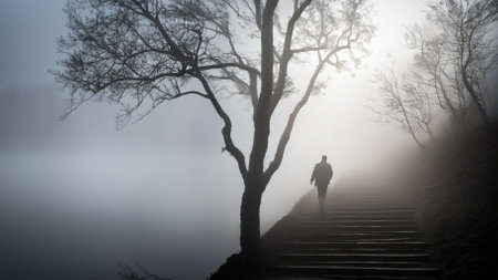An AI illustration of A solitary figure standing on a foggy staircase surrounded by a lake and a tree in a misty landscape