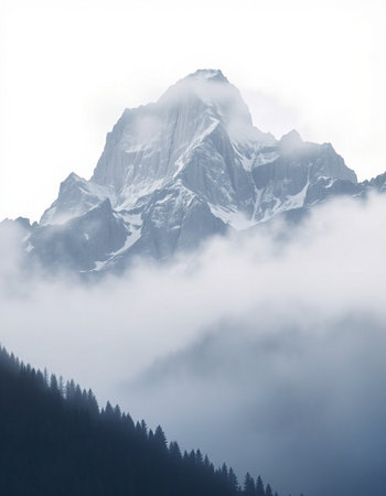 Misty mountains shrouded in fog, creating a serene and mysterious atmosphere.