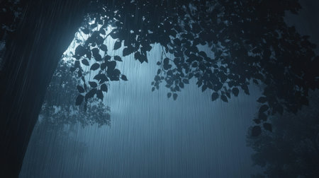 Experience a serene moment in nature as soft rainfall cascades through lush foliage, illuminated by a gentle glow in a mysterious forest setting.