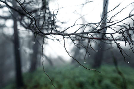 Evergreen forest in a white fog at sunrise. Pine and fir trees close-up. Picturesque scenery. Atmospheric landscape. Pure nature, ecology, environmental conservation, eco tourism