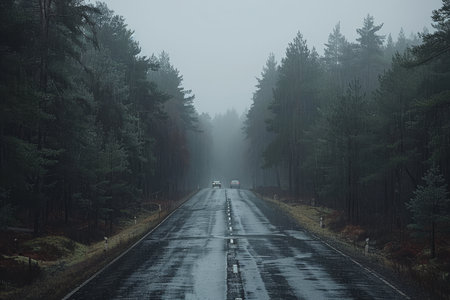 Cars drive cautiously on a wet road surrounded by a dense forest, shrouded in mist. The faint morning light illuminates the scene, creating a serene yet mysterious atmosphere..