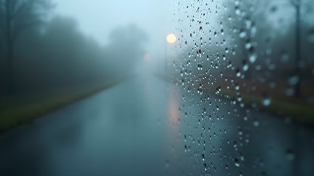 A moody scene of rain droplets clinging to glass, obscuring a blurred, misty road and streetlights. The image evokes a sense of tranquility and atmospheric depth.