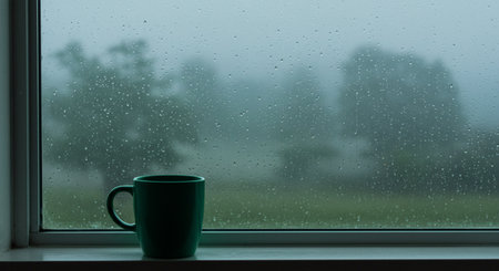 Droplets collect on a window during rain, creating a blurred view of lush greenery outside.