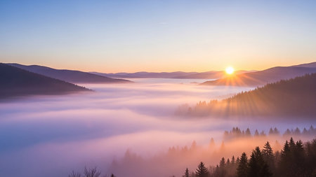 Experience a breathtaking sunrise over a misty forest, where evergreen trees create a serene atmosphere bathed in soft morning light, evoking feelings of tranquility.