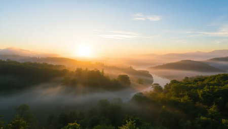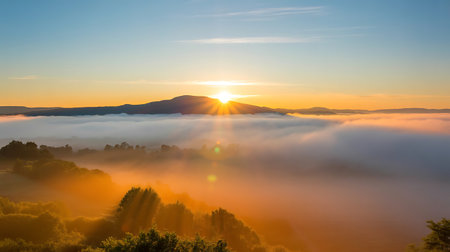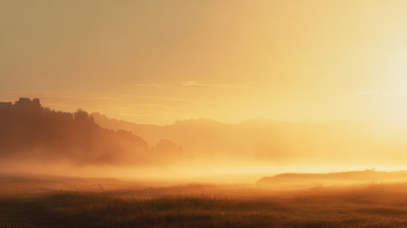 A breathtaking view of a serene sunrise illuminating a misty landscape, capturing the tranquil beauty of nature's colors and soft hills in the background.