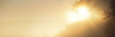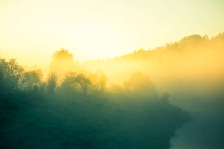 Foggy sunrise over the lake. Beautiful landscape with fog.