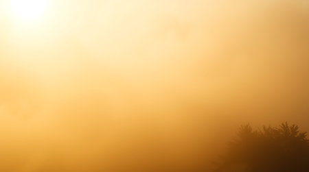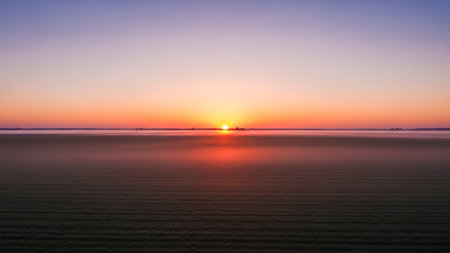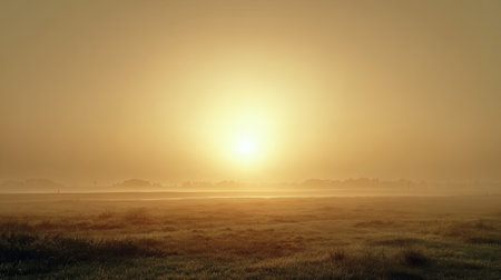 A vibrant sunrise casts a golden glow over a misty, tranquil horizon, creating a serene and ethereal atmosphere.