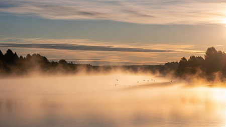 Ethereal Foggy Lake at Dawn with Serene Reflection and Soft Light Moody atmospheric landscape with tranquil water misty forest and glowing sunrise over the horizon