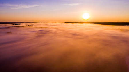Aerial view of a beautiful summer landscape with a fog while dawn. Photo from drone of a foggy landscape in spring. Top view to land while sunrise. Sun is above the horizon