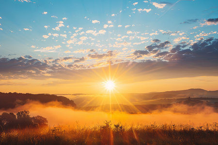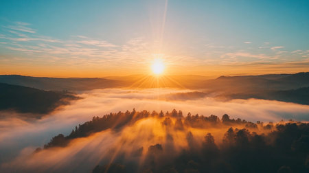 Experience the breathtaking beauty of a sunrise illuminating a misty landscape, with vibrant sun rays piercing through a serene morning sky.