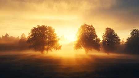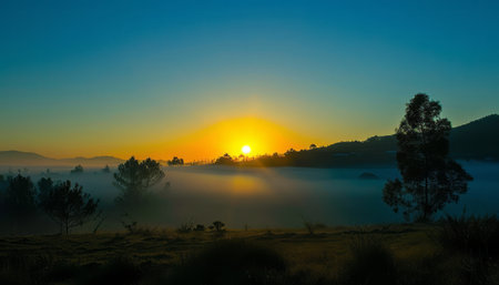Experience the tranquil beauty of a sunrise over a misty landscape, featuring silhouetted trees and rolling hills, capturing the serenity of early morning light.