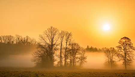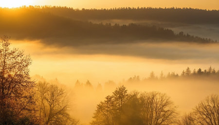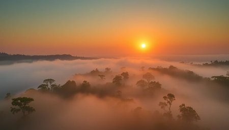 Captivating scenic view featuring a bright sun rising over a lush, tree-filled landscape, with a layer of thick orange fog blanketing the ground, creating a dreamy atmosphere.